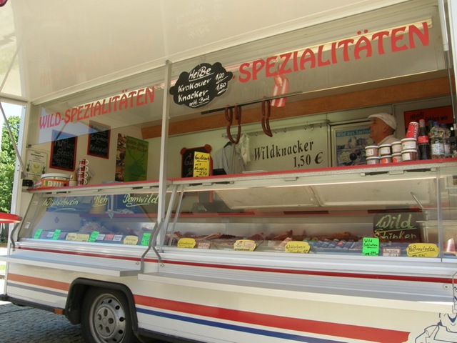 לאחר מכן נסעתי לעיר הציורית פוטסדאם כדי לבדוק מה התחדש שם. משום מה זכרתי שהיו שם הרבה יותר חנויות שוקולד ומאפיות ממה שמצאתי בפועל. מכל מקום, מאחורי פארק הארמונות יש גן בירה נחמד וישבתי לשתות שם בירת לאגר מקומית בשם Rex. הבירה קרויה על שם תוארו של מלך פרוסיה פרידריך הגדול, תושב העיר בעבר ואיש יקר כשלעצמו ("המדינה היא אני"). עם הבירה הגיעה כמובן נקניקיה מקומית טעימה עם סלט תפו"א לא כ"כ טעים. בהמשך הגעתי לשוק הקטן שמאחורי בניין העירייה העתיק. בין דוכני שמונצס ומאכלים שונים מצאתי מכרה זהב: דוכן של איש מצחיק שמוכר בשר ציד.